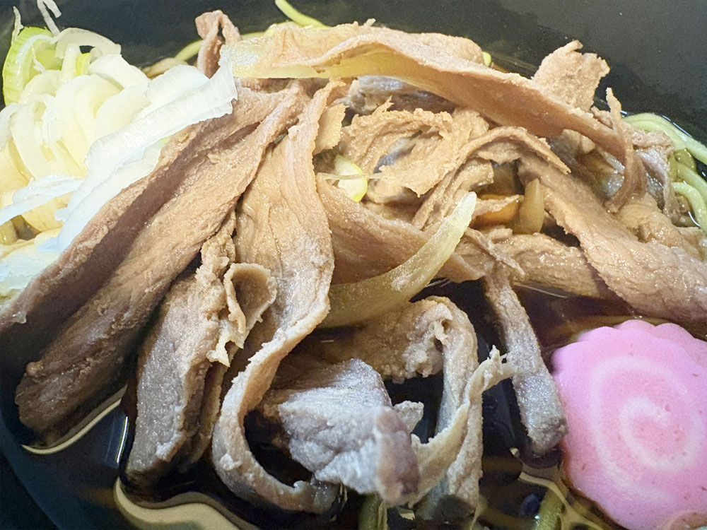 在荞麦面上铺满大量日式炖煮的牛腿肉与洋葱。
