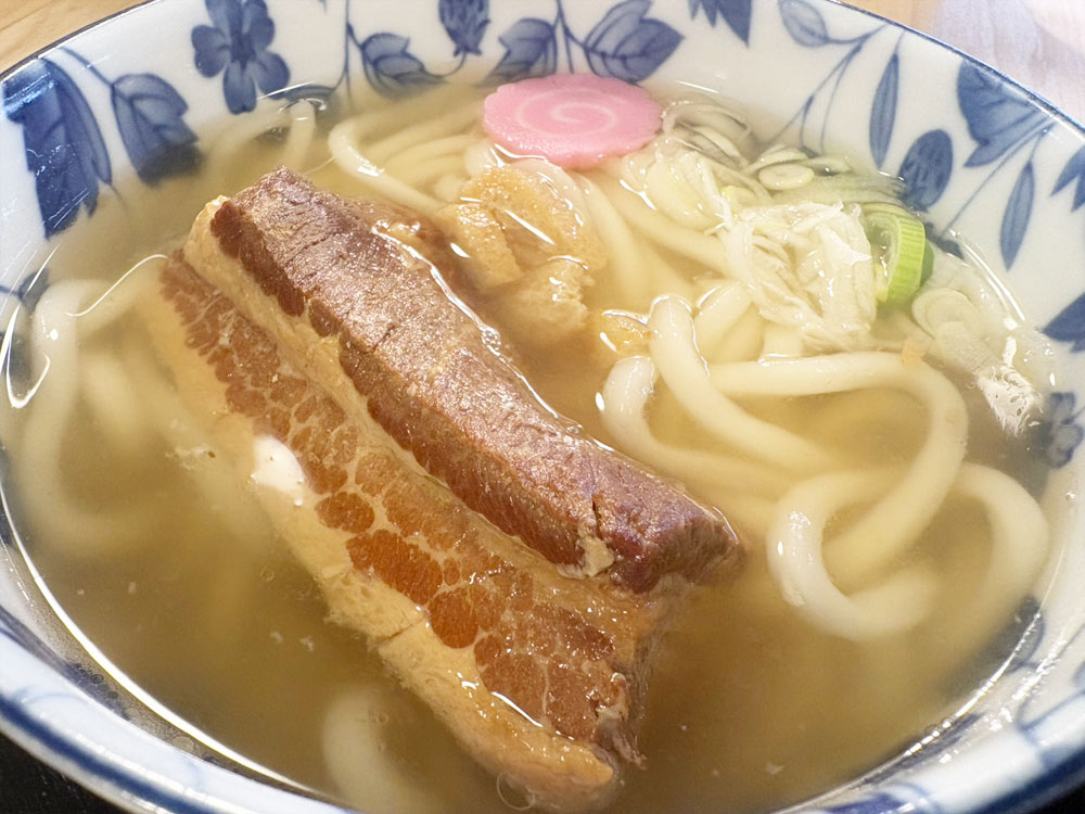 箸でほろほろとほぐれる豚角煮をたっぷり食べて下さい。A block of pork belly seasoned in a Japanese style and stewed until tender, served on top of udon noodles.