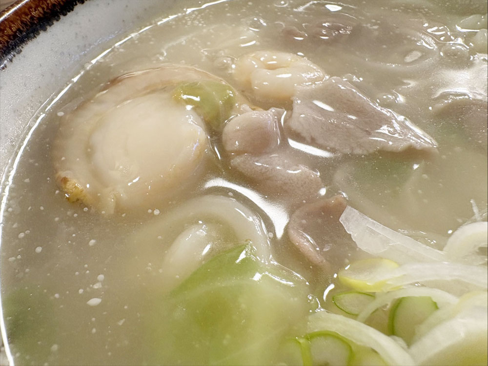 大きなホタテが2個入ってますので大満足です。Two large whole scallops, clams and shrimp with their shells on, and plenty of cabbage are served in a thick soup. It's piping hot udon noodles.